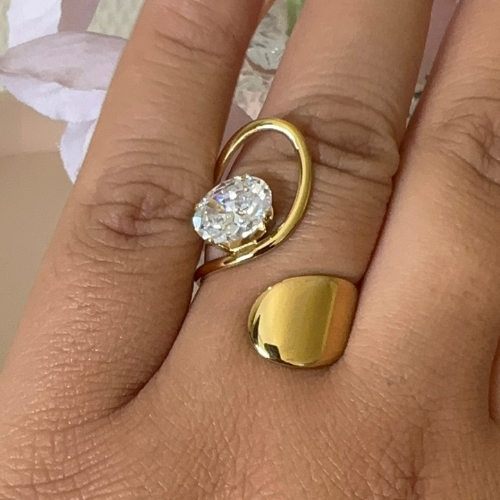 Craquez pour cette bague dorée en acier inoxydable 316L, au design ouvert et sculptural sublimé par un cristal blanc étincelant. Sa forme originale mêle lignes arrondies et modernité, en faisant un bijou à la fois élégant et audacieux.