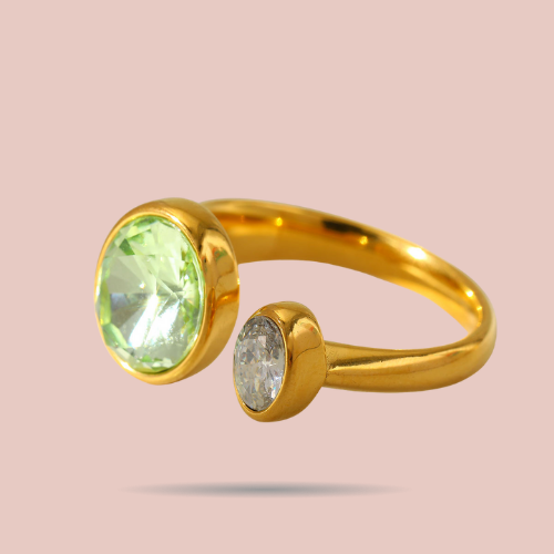Apportez éclat et modernité à votre style avec cette bague dorée en acier inoxydable 316L, ornée d’un cristal vert lumineux et d’un cristal blanc scintillant. Son design ouvert, chic et féminin, en fait un bijou polyvalent, idéal pour le quotidien comme pour les grandes occasions.