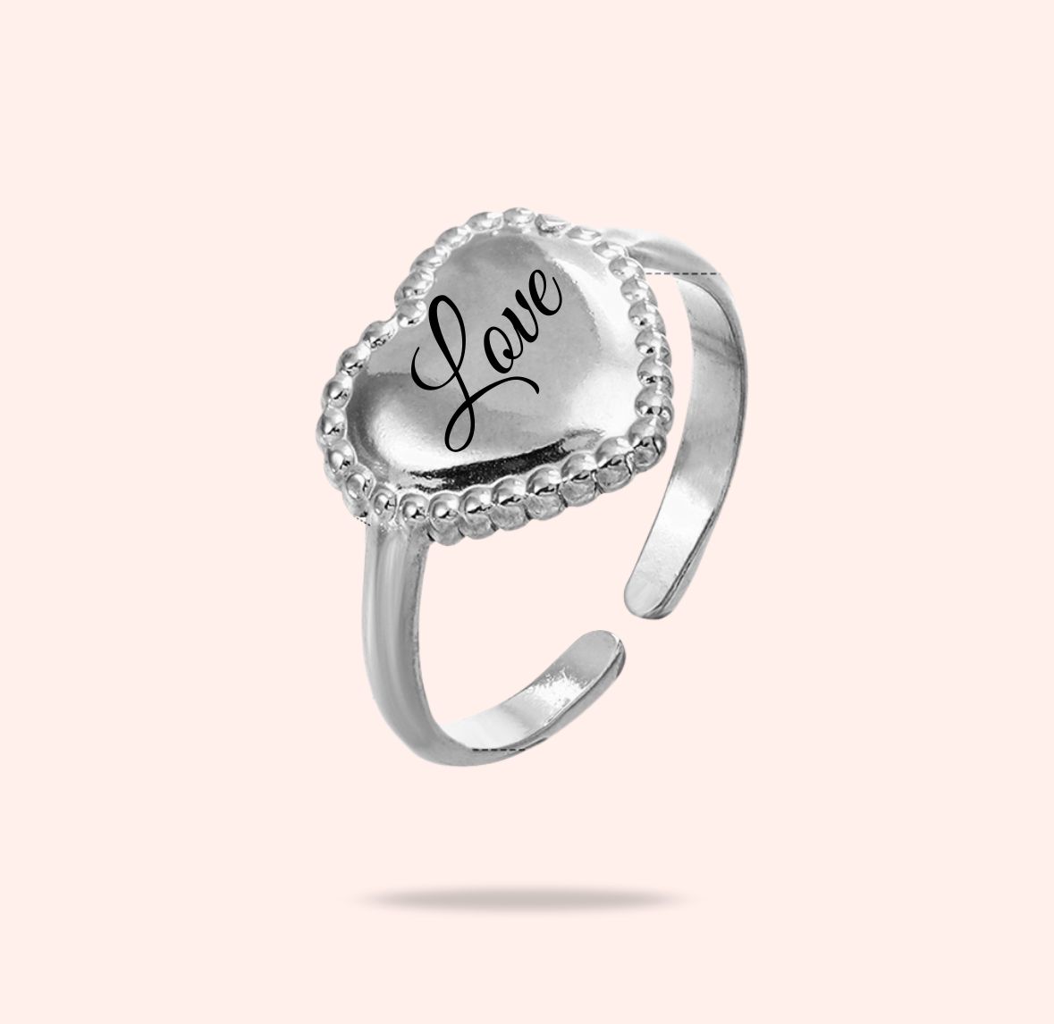 La Bague Liora se distingue par son cœur délicatement bordé de perles et se personnalise avec les initiales ou le mot de votre choix.