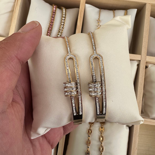 Un bracelet doré en acier inoxydable, au design moderne orné de zirconium étincelant. Élégant, résistant à l’eau et parfait pour briller en toute occasion.