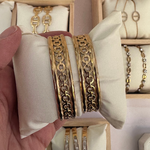 Ce bracelet doré en acier inoxydable se distingue par son design travaillé, composé d’un motif double chaîne finement sculpté. Alliant robustesse et élégance, il apporte une touche de sophistication à vos tenues, qu’elles soient casual ou habillées.