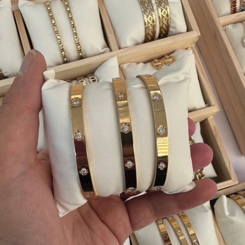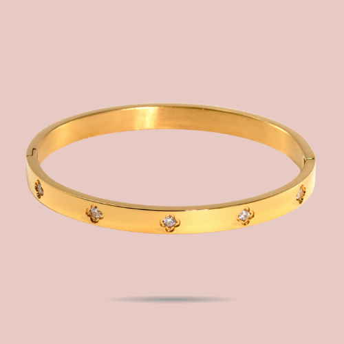 Laissez-vous séduire par la pureté et le raffinement de ce bracelet en acier inoxydable doré, orné de zircons scintillants sertis avec finesse. Son design minimaliste, souligné par des lignes épurées, en fait un bijou intemporel qui rehausse instantanément toutes vos tenues.