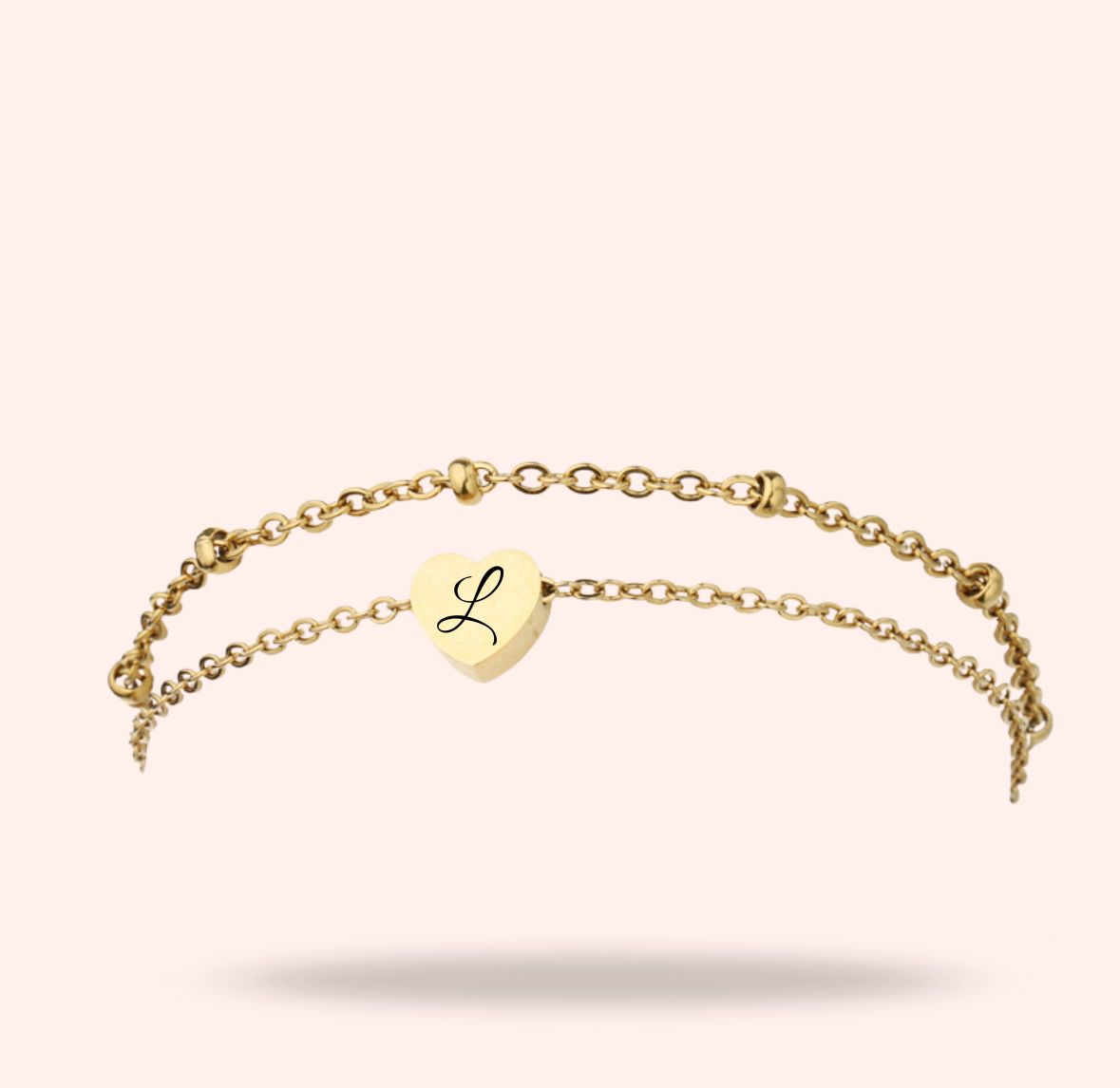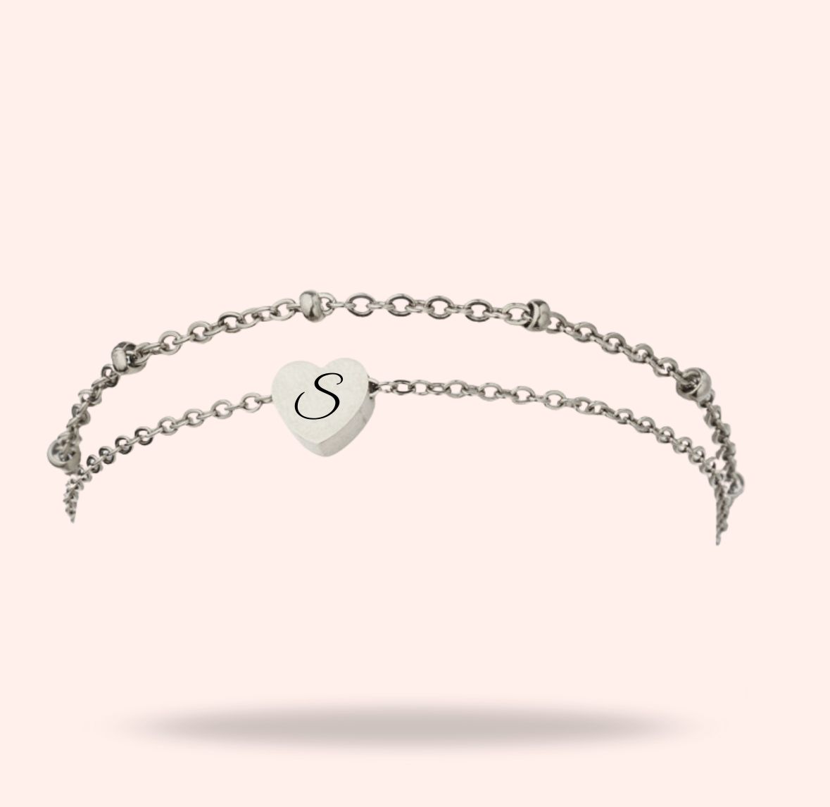 Le Bracelet Léna se compose d’une double chaîne fine en acier inoxydable et d’un petit cœur à personnaliser avec l’initiale de votre choix.