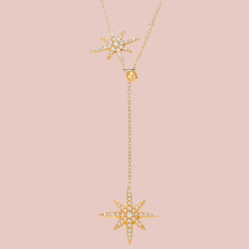 Illuminez vos tenues avec ce magnifique collier étoile polaire en acier inoxydable doré, sublimé par des cristaux de zirconium éclatants. Son design en Y avec ses deux étoiles scintillantes symbolise la lumière et la guidance, apportant élégance et raffinement à votre style.