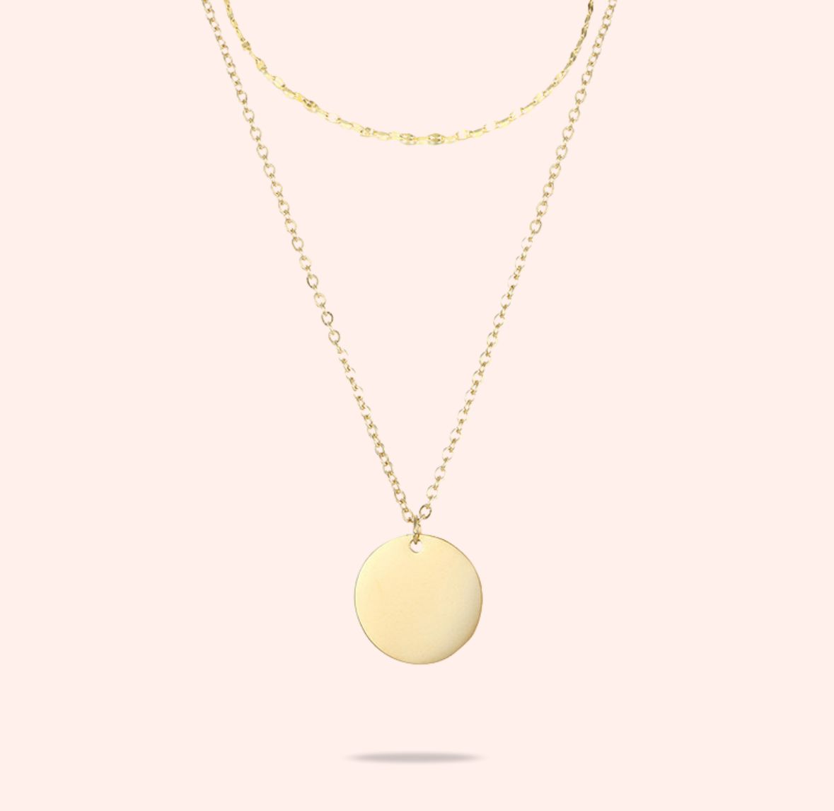Son médaillon rond en acier inoxydable doré peut être gravé avec vos mots, vos initiales ou une date précieuse, transformant ce bijou en une véritable pièce porteuse de sens.