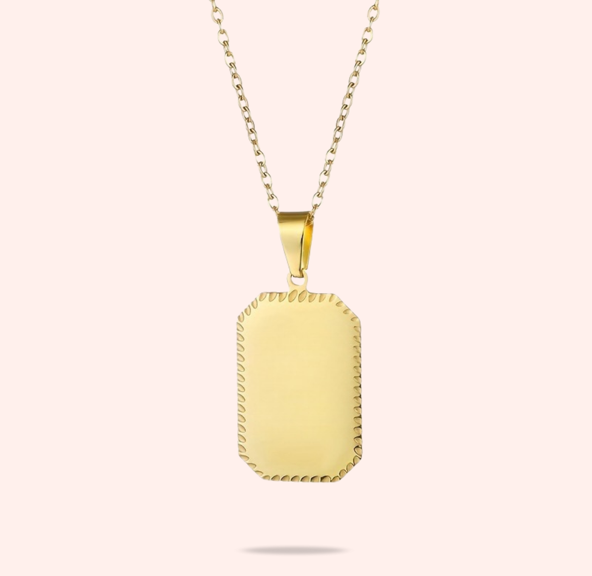 Affirmez votre style avec le collier Plaque Rectangulaire personnalisable en acier inoxydable doré. Son pendentif rectangulaire aux bords finement décorés offre une grande surface idéale pour graver un prénom, une date, des initiales ou un message spécial.