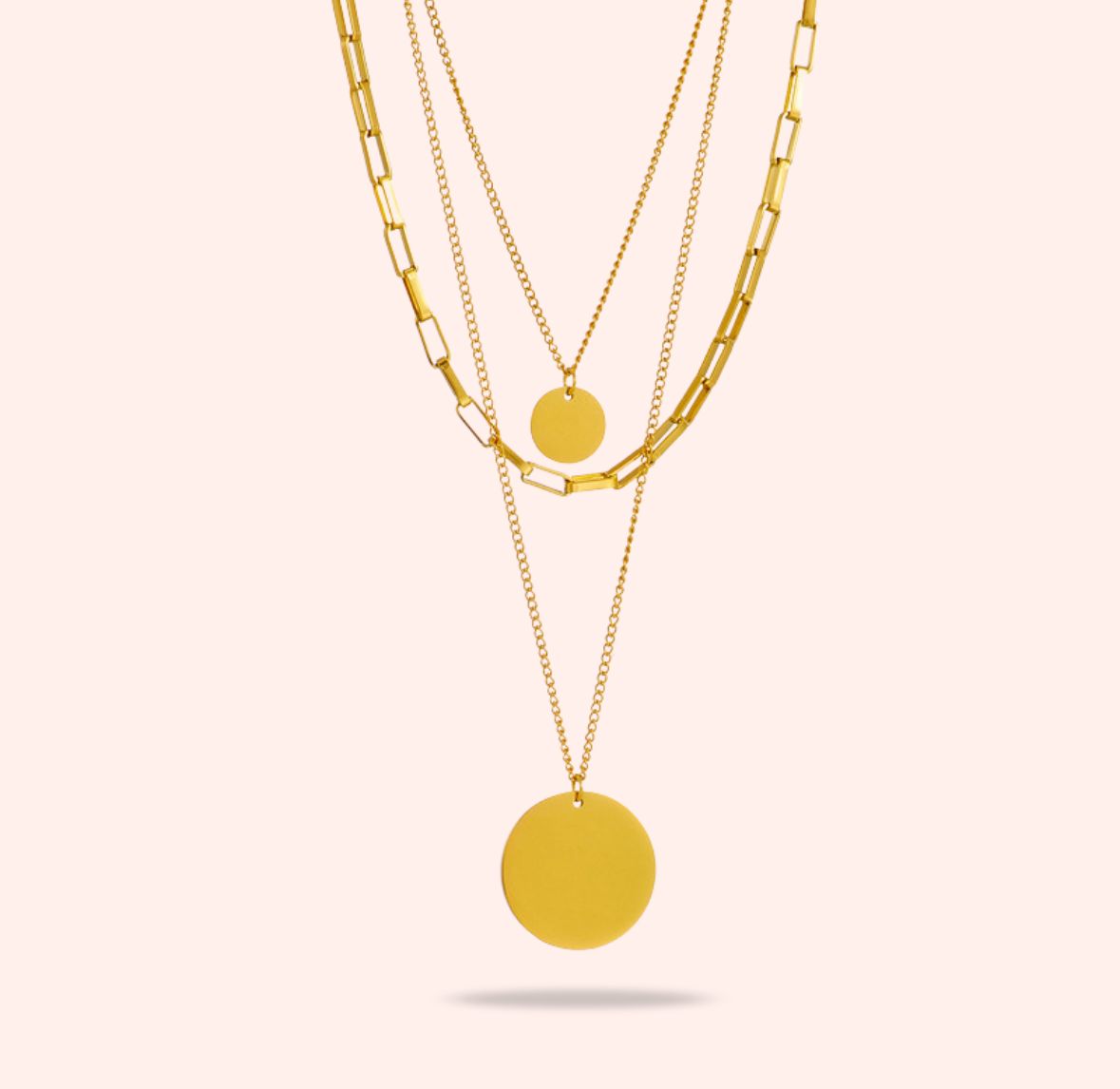 Le Collier Soraya combine trois chaînes délicates en acier inoxydable doré : un choker à maillons fins, une médaille discrète et un médaillon plus généreux. Ensemble, ils créent une harmonie parfaite, à la fois moderne et intemporelle.